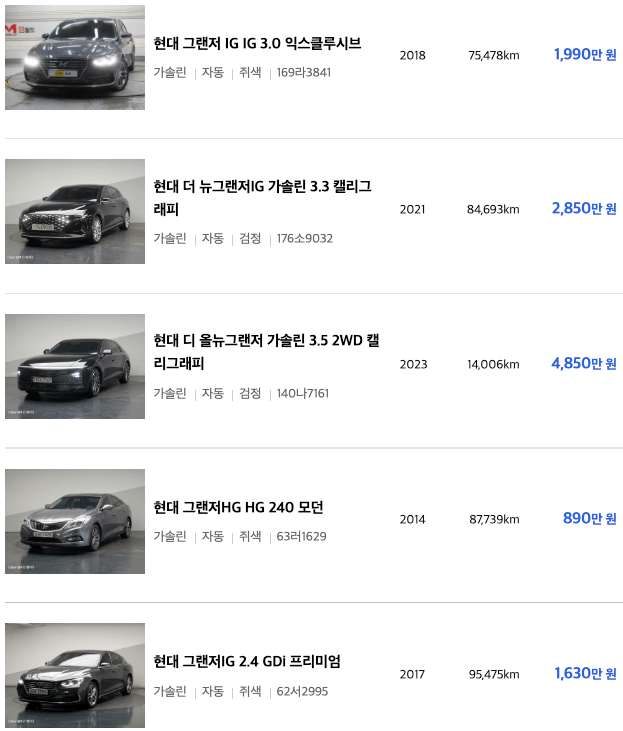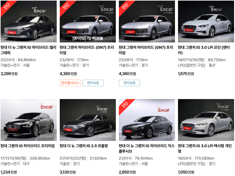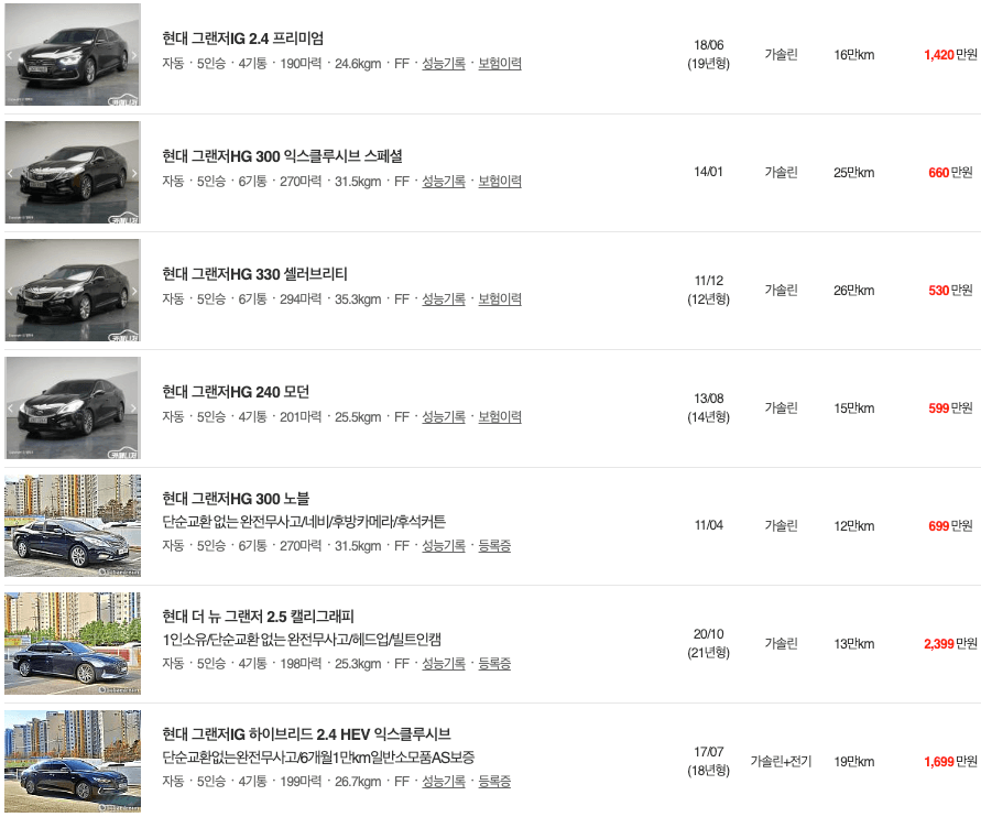 그랜저 중고차 구형부터 신형까지 총정리해드려요. 현대 탑픽 GN부터 하이브리드, ig, hg, xg, lpg 전모델 중고 시세표 확인하신 도움 되시길 바랄께요. 중고차 구입하려면 차상태와 시세 확인 제일 중요하죠. 국내 최대 중고차 사이트 5곳의 매물도 함께 올려드리고 있어요. 자 그럼 계속 내려가봐요.