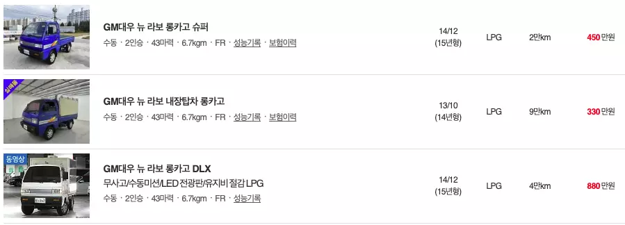 다마스 중고차 시세 가격 캠핑카 포토 2011~2021년
