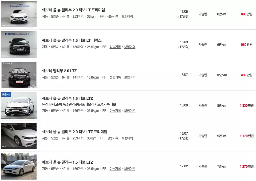 말리부 중고차 총정리합니다. 쉐보레 인기 차종인데요. 구형부터 올 뉴, 더 뉴, 가솔린, 디젤, LPG 등 모든 차종의 중고시세와 중고차 가격을 아래에서 확인해보세요. 2011년ㅂ터 2023년 현재 시세 모두 반영하고 있어요. 중고차 구입은 시세와 시장 가격을 알고 가시면 합리적으로 구입할 수 있어요. 참고해주세요.