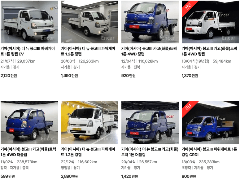 봉고3 중고차 가격 시세표 EV lpg 기아 트럭 포토 킹캡 더블캡 4륜 2010~2023 2024