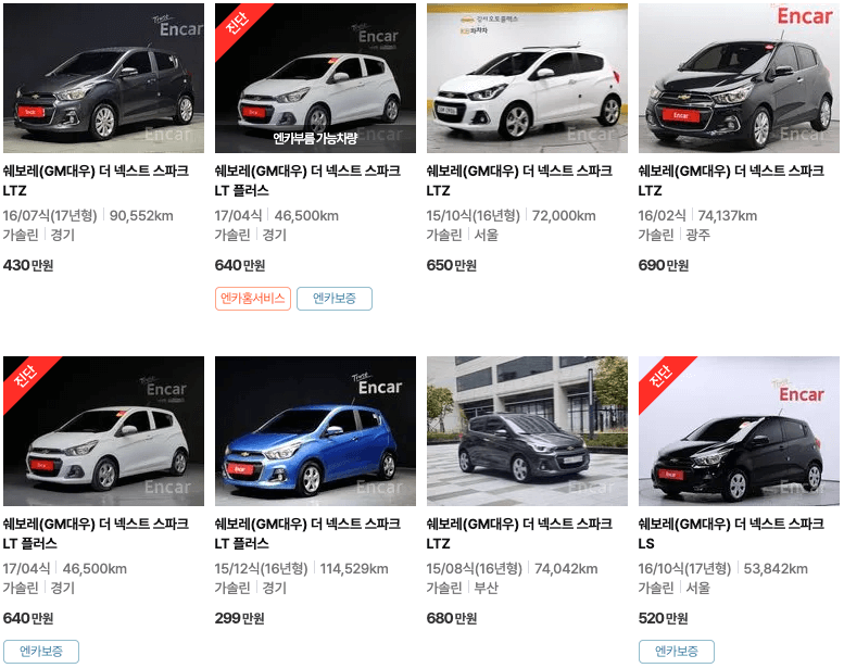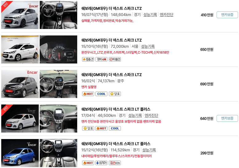 엔카, KB차차차, K카 3개 중고차 사이트에 등록된 스파크 중고차 매물 확인해보겠습니다.