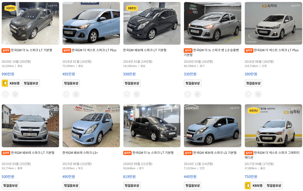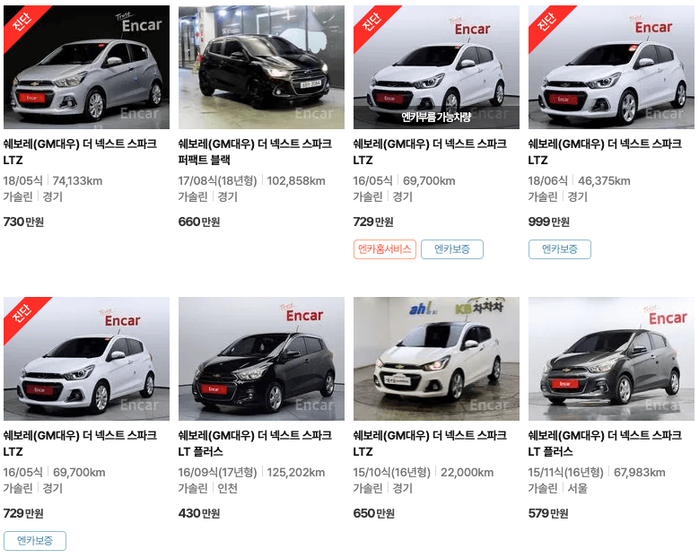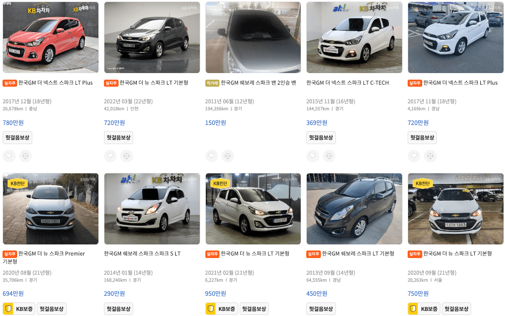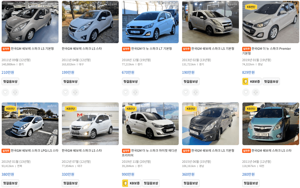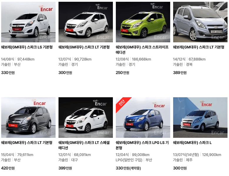 중고차 시장에 나와 있는 스파크 중고차 매물과 연식별 모델별 스파크 중고차 시세표입니다.