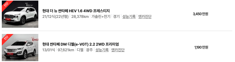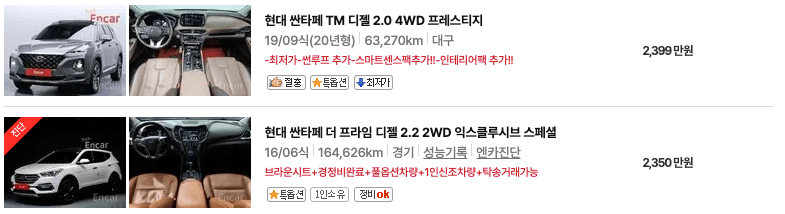 싼타페 중고차 가격 및 시세표 정리했어요. SUV 하면 싼타페를 삐놓을 수 없죠.현대 싼타페는 현대자동차의 전륜구동 기반 중형 스포츠 유틸리티 자동차로, 2000년 6월부터 생산되고 있습니다. 더 뉴 싼타페(TM)는 가솔린, 가솔린&전기, 디젤 연료를 사용하며, 복합연비는 9.5~15.3㎞/ℓ입니다. 2023년형 가솔린 2.5 터보 6인승의 가격표는 빌트인 캠(보조배터리 포함) 640,000원, 플래티넘 Ⅱ 1,040,000원, 헤드업 디스플레이 590,000원 등입니다. 현대자동차는 2023년 8월부터 디 올 뉴 싼타페를 초기형으로 출시했습니다.
