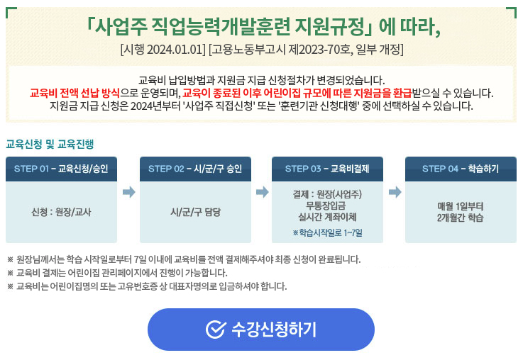 삼성 e보수교육캠퍼스에 접속하여 회원가입을 한 후, 본인이 수강할 과정을 선택하고 신청하시면 됩니다. 시/군/구 보육정책담당자가 교육 대상자 여부를 확인한 뒤 승인 또는 미승인 처리를 하게 되죠.
