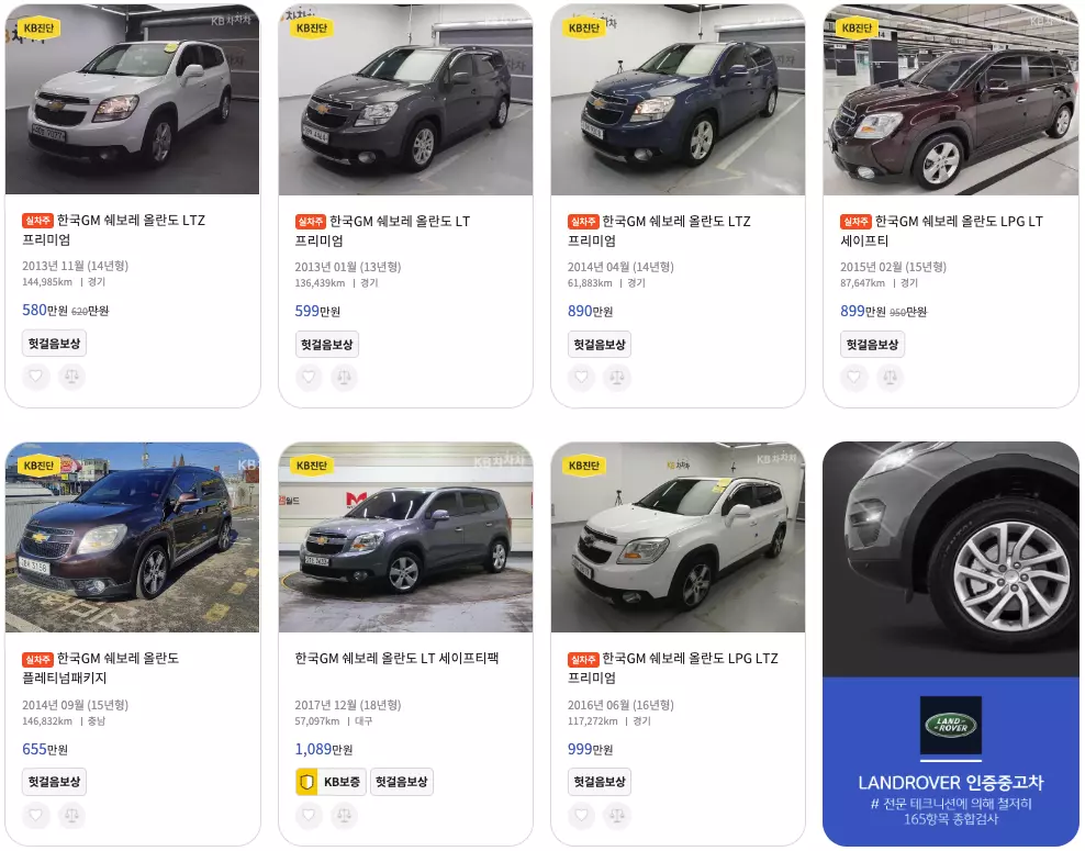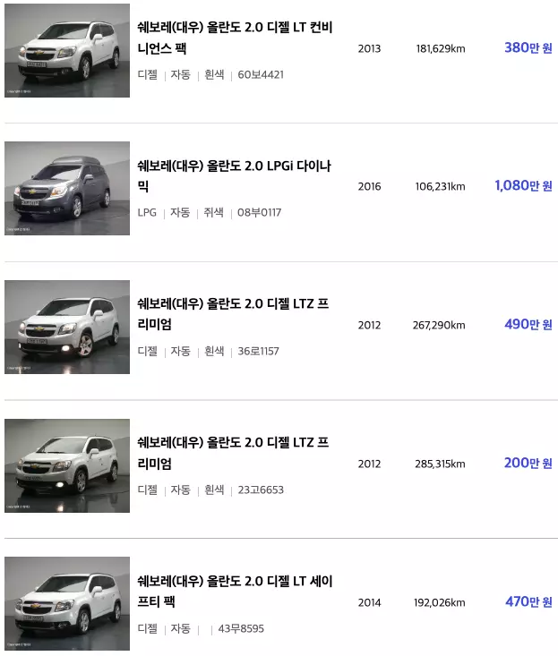 올란도 쉐보레 중고차 가격 시세표