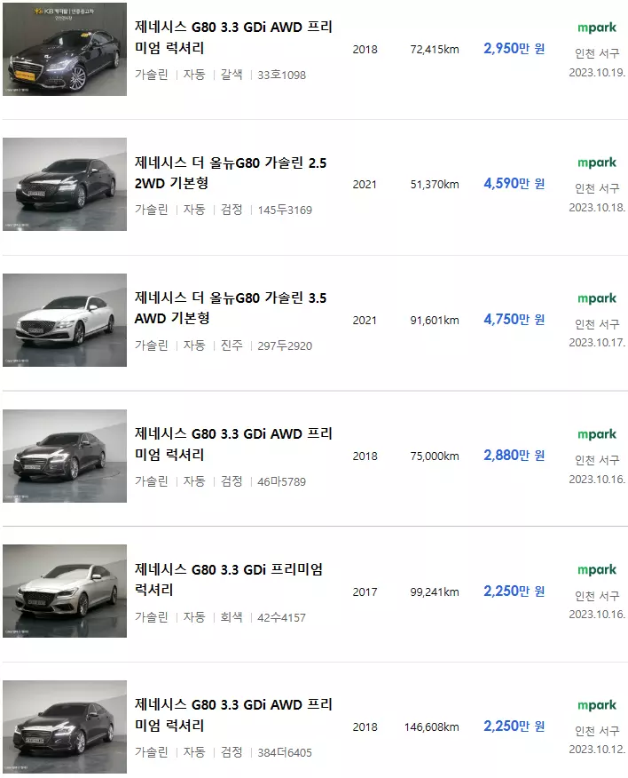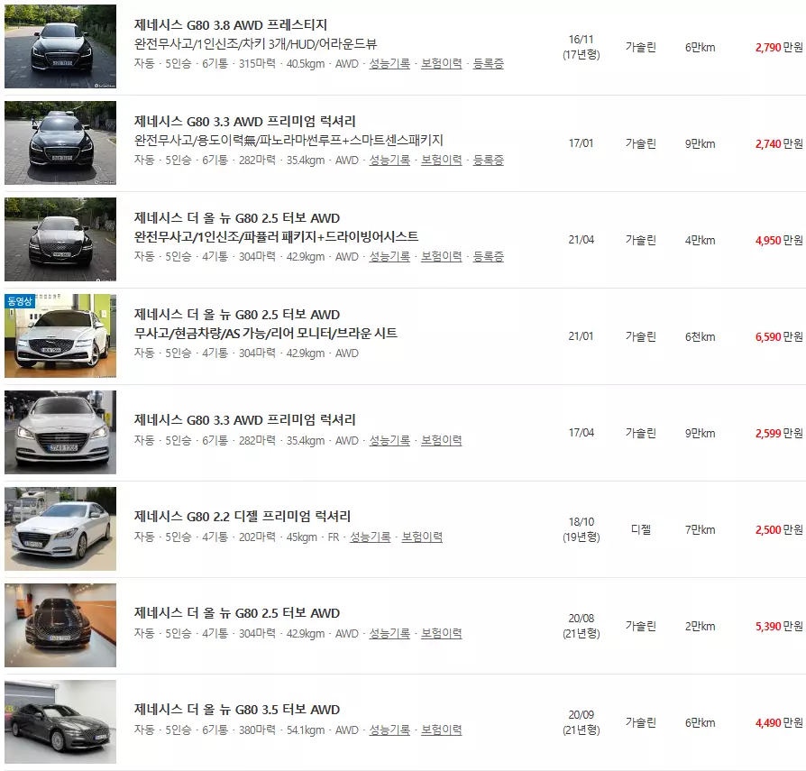 제네시스 G80 중고차 가격표 및 매물