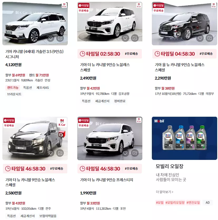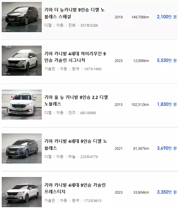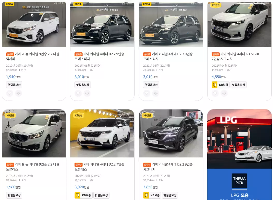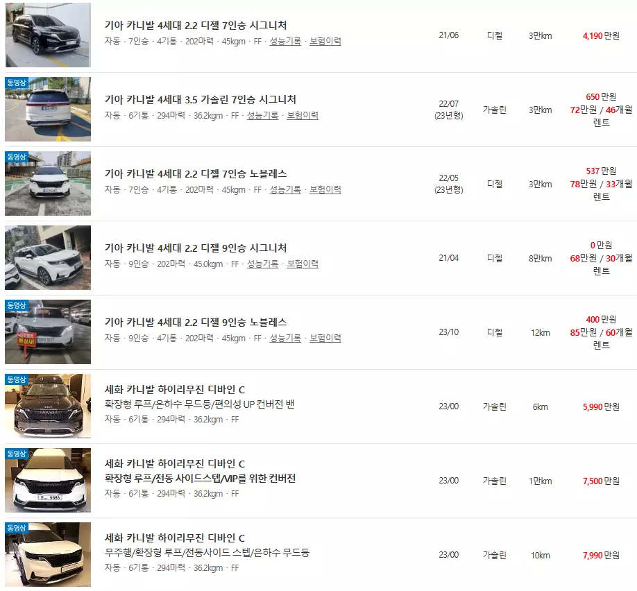 전통적인 베스트셀링카 카니발은 출시된 지도 오래 되었기 때문에 등록된 매물이 아주 많습니다. 선택의 폭이 넓기 때문에 각 사이트 마다 비교해보신 후 결정하셔도 무난합니다.