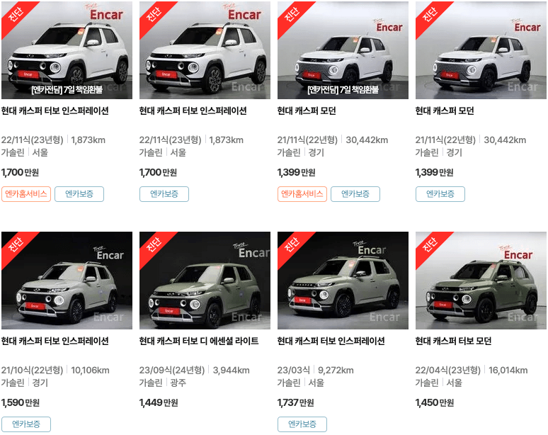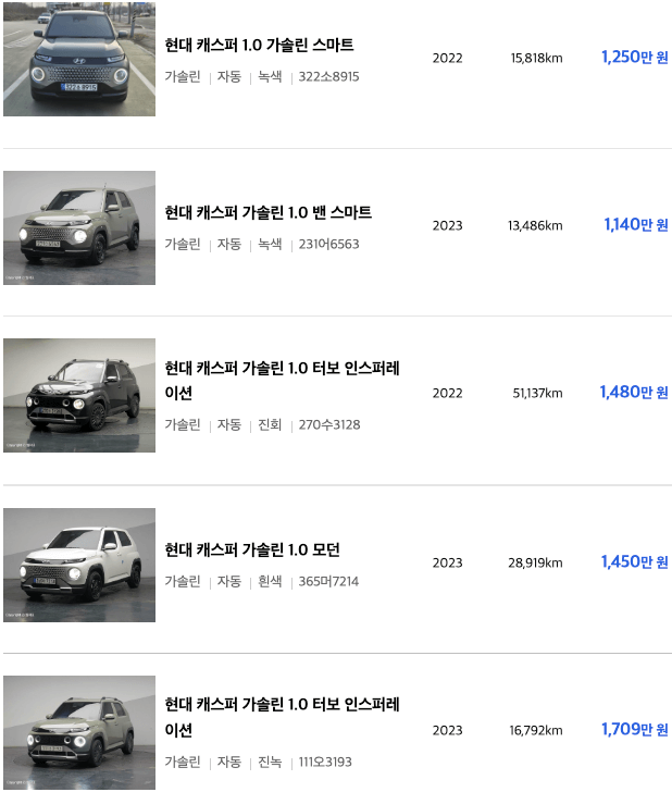 캐스퍼 중고차 가격 시세표 2021~2024년