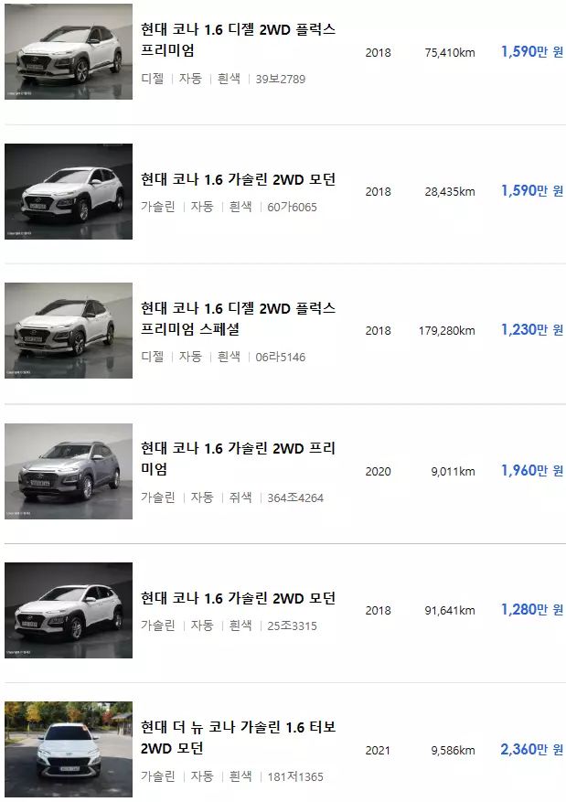 코나 중고차 시세표 : 하이브리드 가솔린 디젤