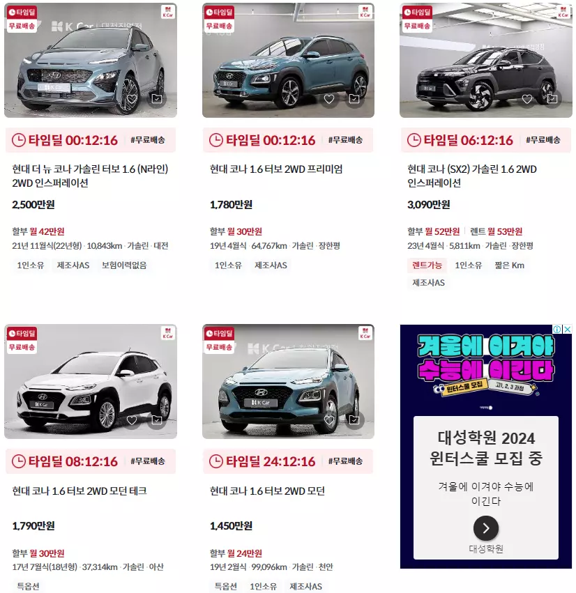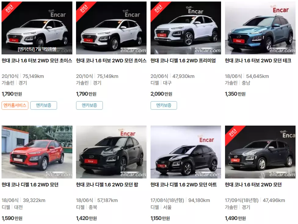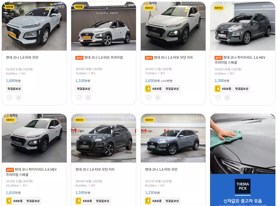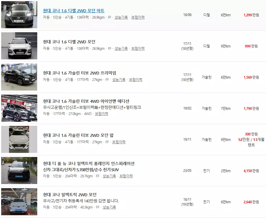 위에서 제공한 코나 중고차 시세표와 아래에서 이어지는 각 중고사이트 등록된 가격을 기준으로 알차 구매 성공하면 좋겠네요.