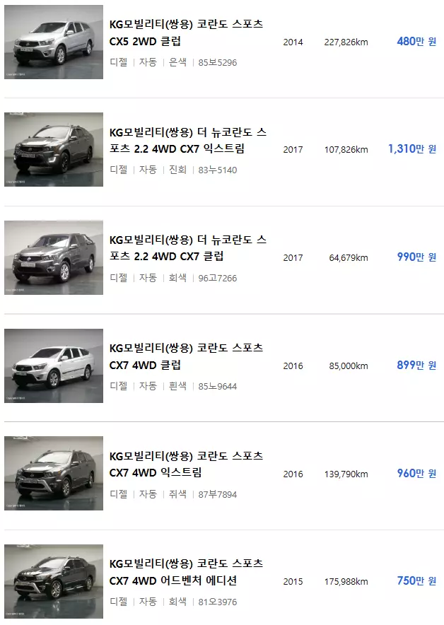 코란도 스포츠 중고 가격표 | 다나와자동차 등록 매물