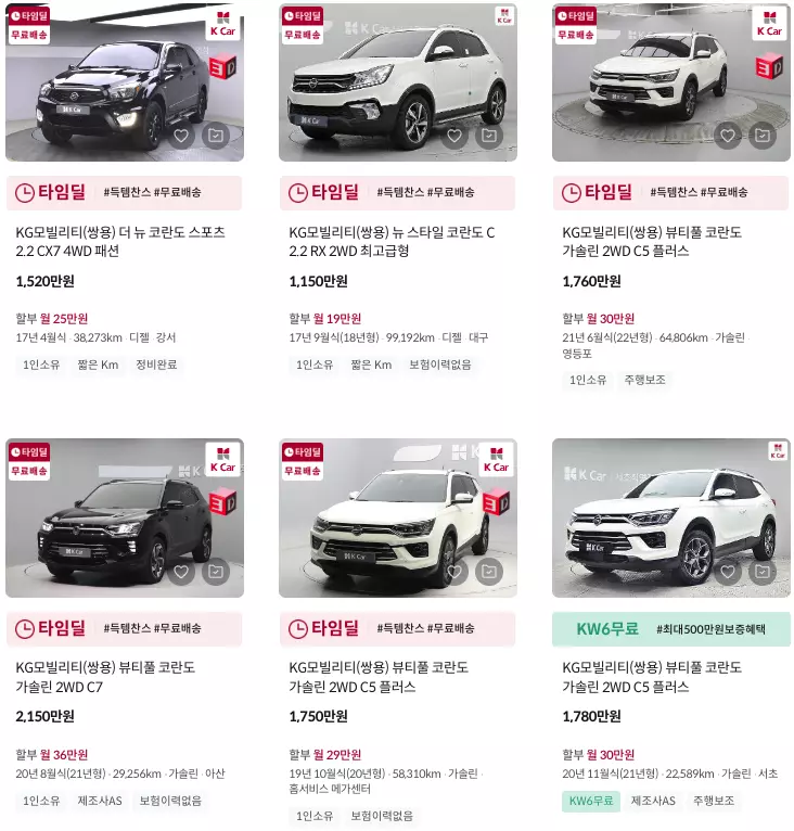 코란도는 전통적인 SUV 차종이죠. 오랜 시간 동안 다양한 세대와 모델로 거듭나고 있는데요. 견고한 내구성과 다목적 차량인데요. 요즘에는 가성비 좋다고 입소문이 나면서 중고 수요자 많아 지고 있어요.