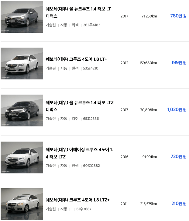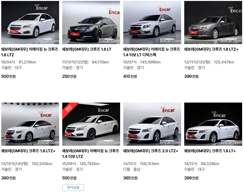 쉐보레 크루즈 중고차 가격표 엔카 등록매물