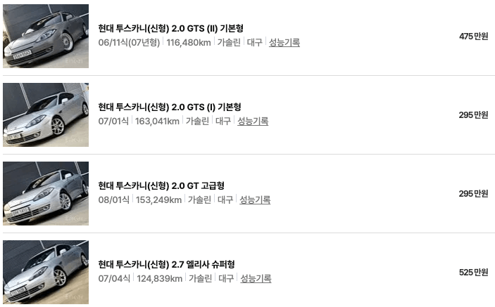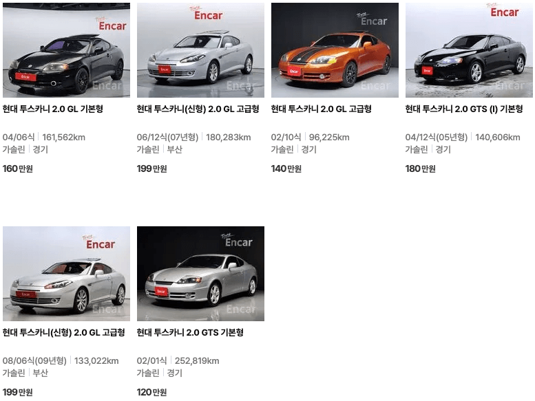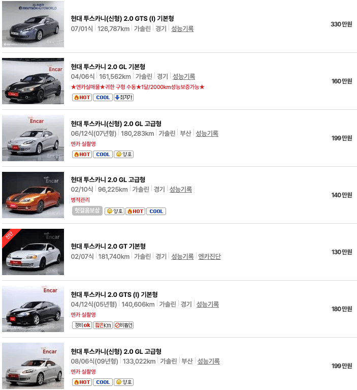투스카 중고차 가격 및 시세표 총정리 했어요. 투스카니는 현대자동차에서 생산한 전륜구동 방식의 스포츠 쿠페입니다. 차명은 이탈리아의 휴양 도시에서 따왔습니다. 투스카니의 공차중량은 약 1,330kg으로 제네시스 쿠페보다 200kg 가볍습니다. 엔진 형식은 DOHC VVT, 배기량은 1,975cc, 최고출력은 143/6,000입니다.