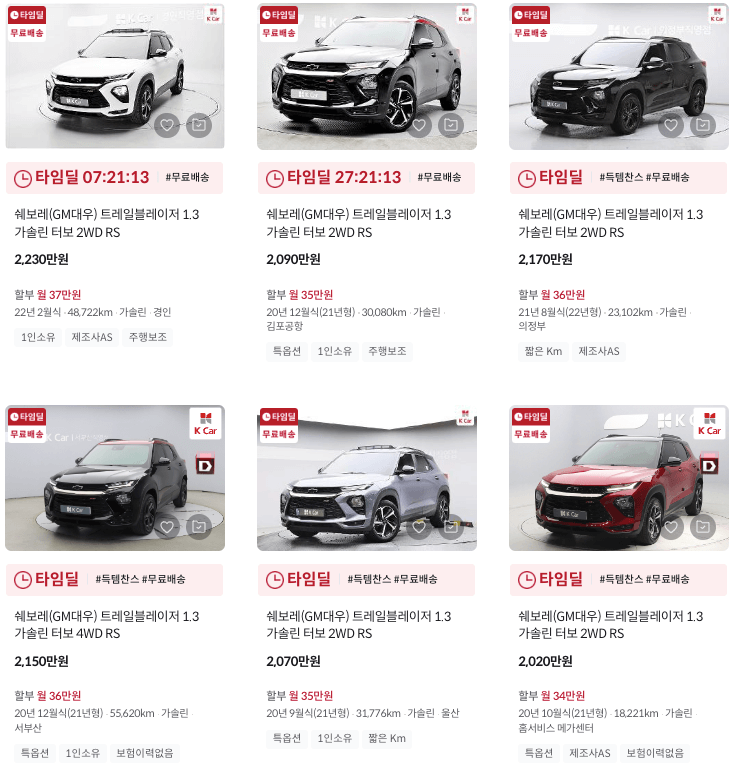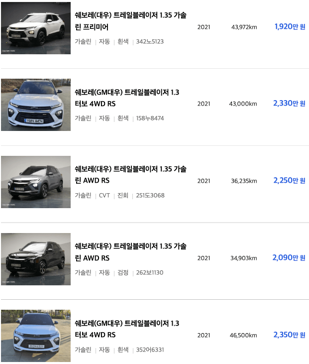트레일블레이저 중고차 가격과 시세 정리해드려요. 쉐보레 생산 한국GM 수입 판매하고 있어요. 2020년 출시되었고요. 2023년 7월 169일 페이스리프트 모델 더 뉴 트레일로 여론의 주목을 잡았는데요. 2024년형에 대한 소비자 관심도가 점점 높아지고 있어요. 중고차 매물등록현황과 기본정보를 확인해보세요.