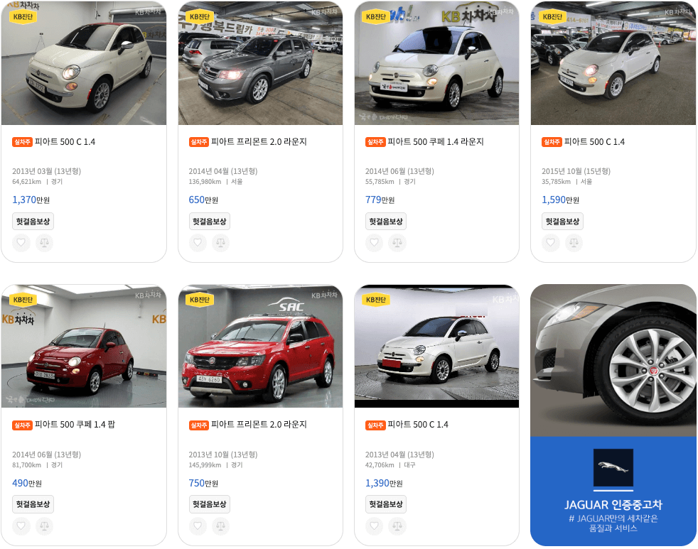 파아트 중고차 가격 및 시세 알아볼께요. 확인할 수 있는 모델은 500, 500S 등 입니다. 목차 피아트 매물등록현황 2023. 12월 엔카 KB차차차 K카 보배드림 다나와자동차 등록대수 92대 70대 2대 7대 2대