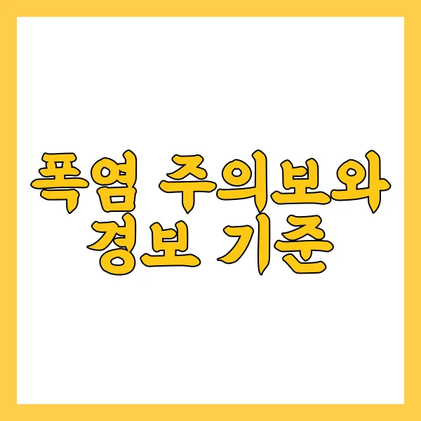 이처럼 폭염 특보 기준이 명확하게 제시되어 있어, 현재 우리가 처한 폭염 상황을 쉽게 파악할 수 있습니다. 특히 폭염 경보가 발령되면 건강에 매우 위험한 상황이므로, 신속한 대응이 필요합니다!