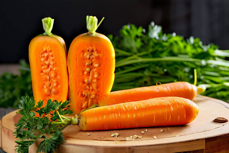 - 당근: 베타카로틴이 비타민 A로 전환되어 피부 재생을 돕고, 여드름과 기미를 개선합니다. 또한, 자외선으로부터 피부를 보호합니다.