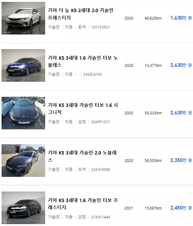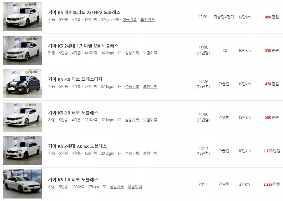 K5 중고차 가격표 및 등록 매물