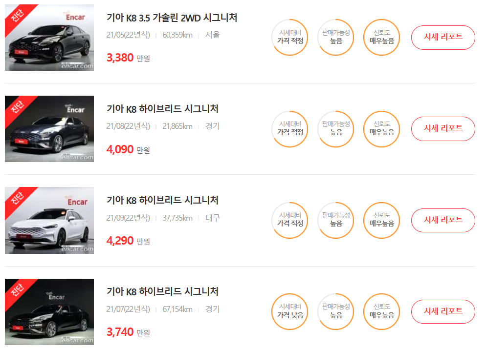 K8 기아 중고자동차 가격표 및 시세표를 정리했습니다.