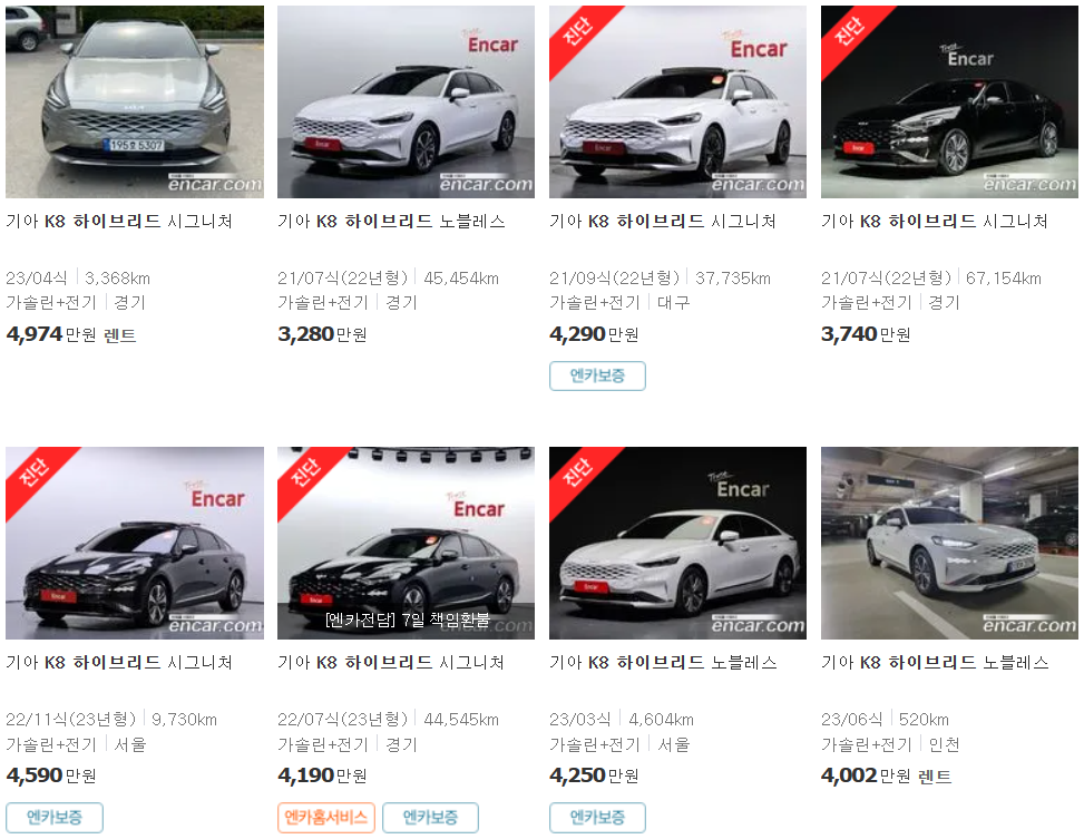 먼저 2023년식 2,584만원~4,599만원이고요. 2022년식은 2,817만원~4,215만원, 2021년식은 2,693만원~3,826만원입니다. 다음으로는 K8 하이브리드 중고차 시세 보겠습니다. 2023년식은 4,025만원에서 4,759만원, 2022년식은 3,808만원에서 4,387만원, 2021년식은 3,551만원에서 4,067만원입니다.