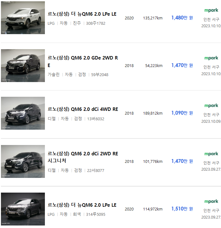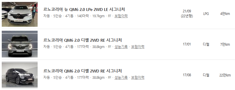 중고 최대 규모인 5개사이트 등록된 QM6 중고차 가격표 확인해보겠습니다.